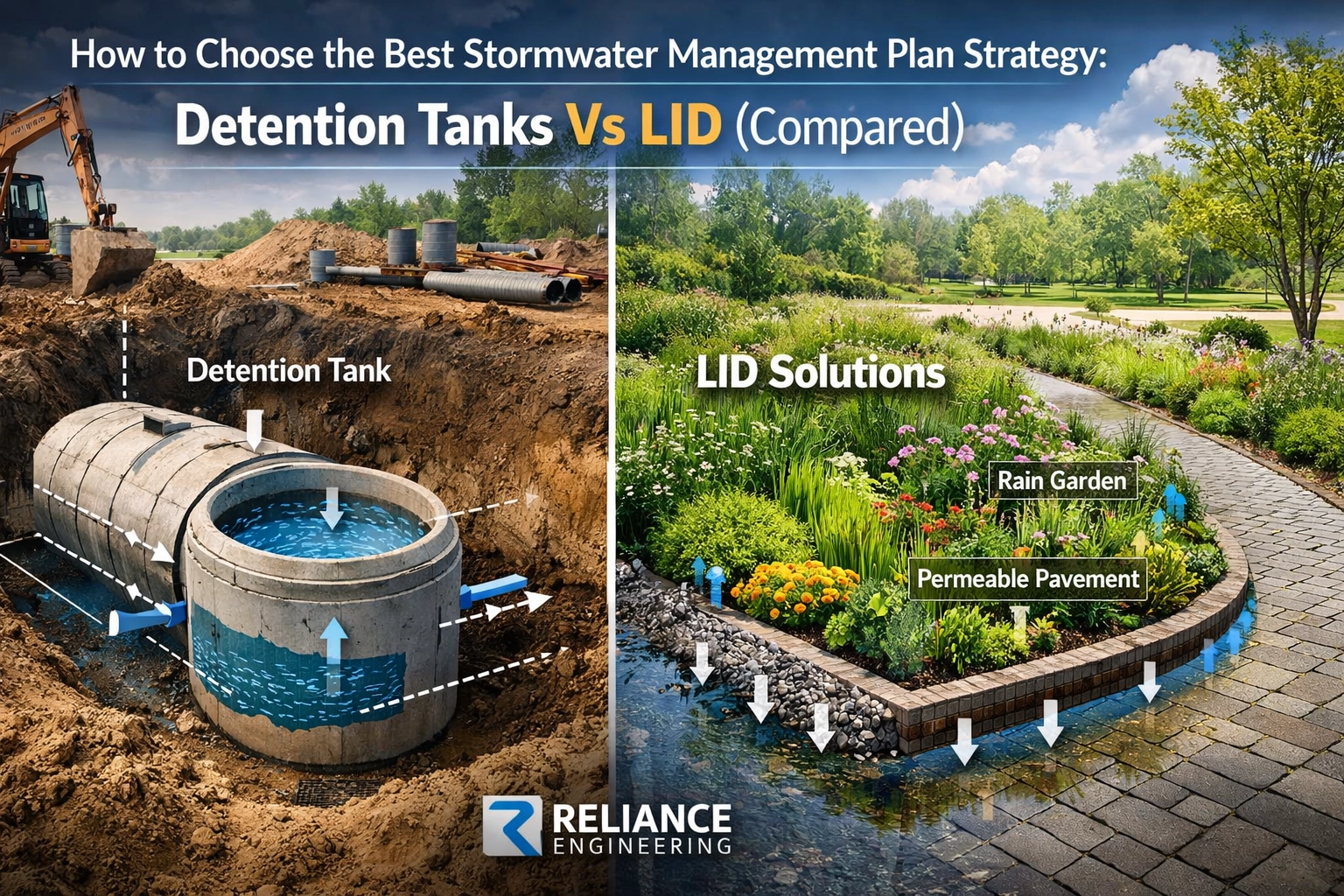 At Reliance Engineering, we have spent over 20 years drafting Stormwater Management Reports that balance regulatory compliance with site-specific constraints. In this guide, we compare these two strategies to help you decide which is best for your next land development project.